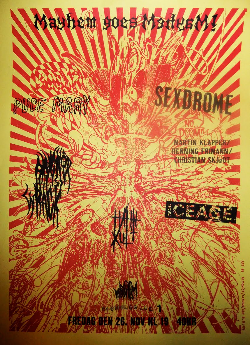 Da vennerne i SEXDROME gik i gang med deres Burzum-inspirerede black metal punk, virkede det som om folk havde fået deres aggressioner ud. Men Loke & Co. gav den under alle omstændigheder gas med en del tungere numre fra deres debut 12". En stor aften på Mayhem med meget eklektisk udvalg af div. musik stilarter, som det altid er til Mayhem koncerter. Tjek stedet ud, selvom det er lidt svært at finde. Bus 6A kører tæt forbi.